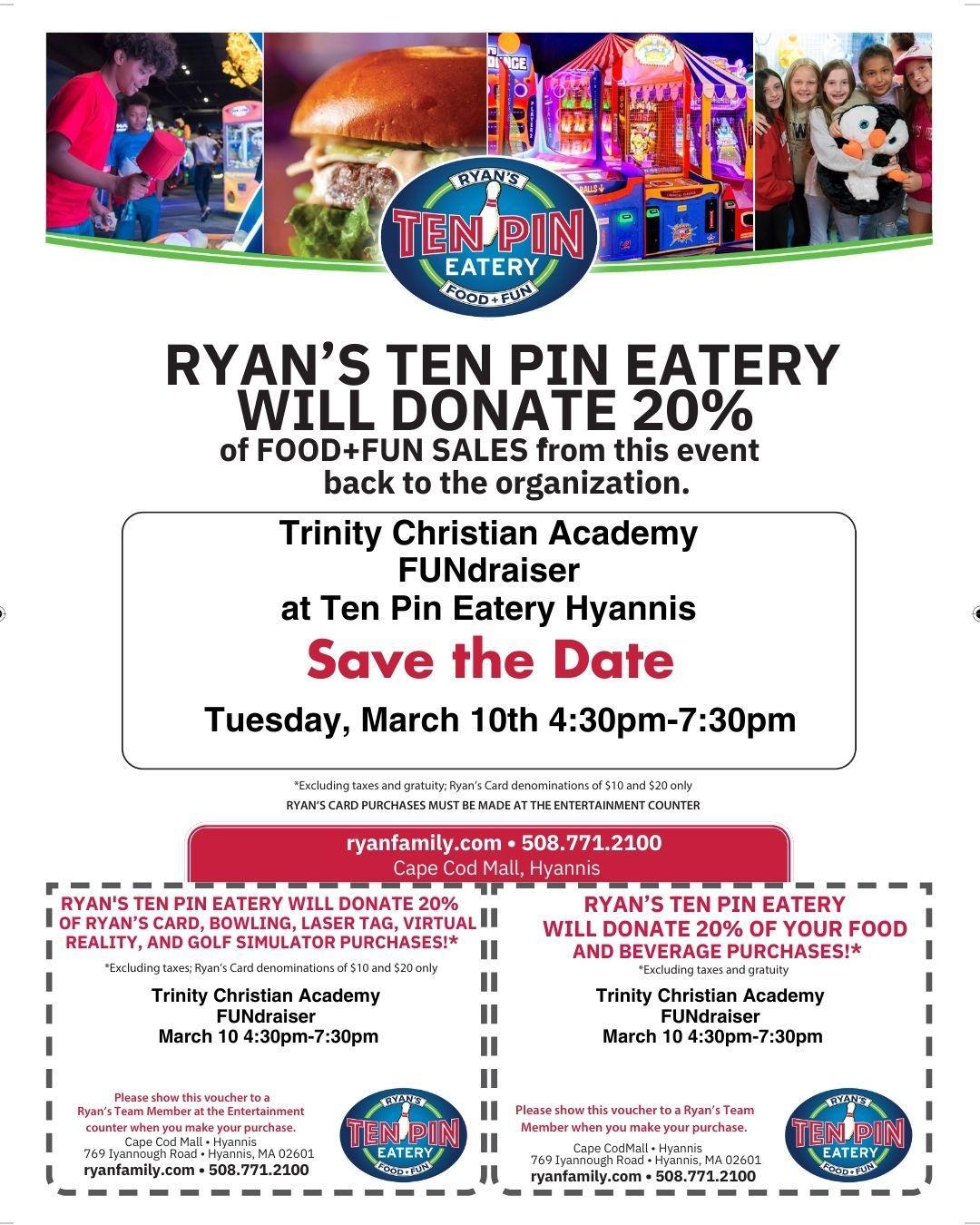Join us at Ryan's Ten Pin Eatery on Tuesday, March 10th, 4:30PM - 7:30PM for a night of great food and fun! Ryan's will generously donate 20% of all food and fun sales from this even back to TCA! Invite your friends and family! Vouchers for this event will be sent home with students. Present the voucher when you place your purchase.